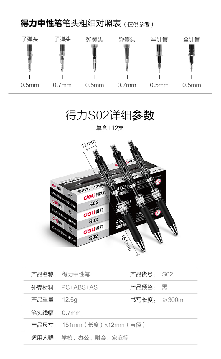 得力 S02 0.7mm 按動軟中性筆簽字筆 黑色12支/盒