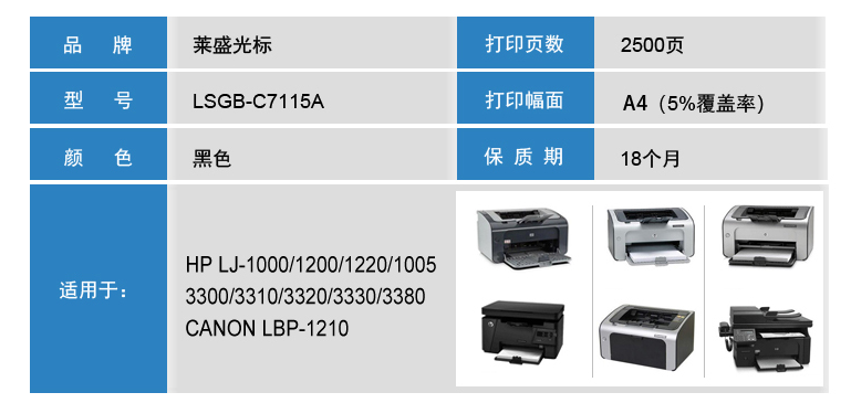 萊盛光標 LSGB-C7115A 黑色粉盒 適用:HP LJ-1000/1200/1220/1005/3300/3310 單位:支