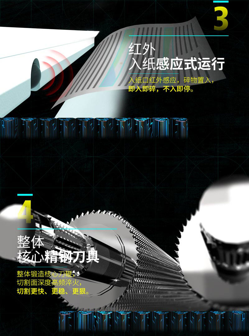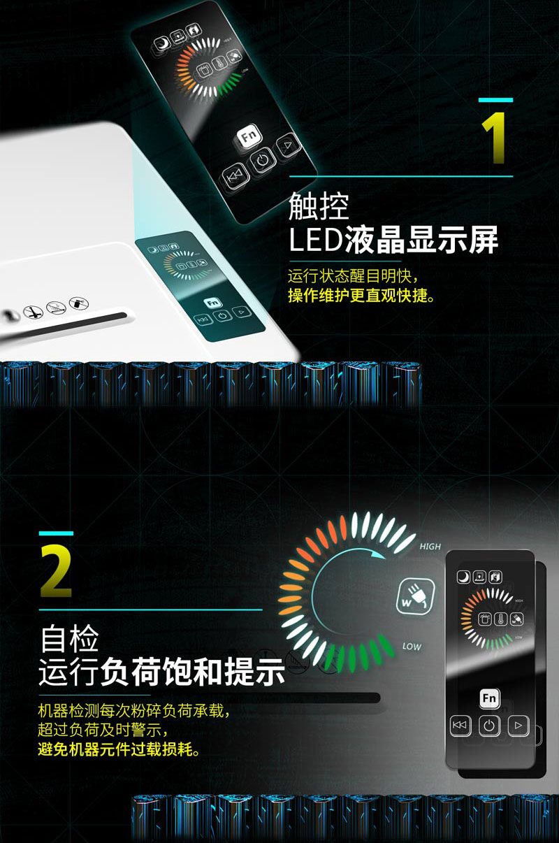 粉碎耗能觸屏顯示 卡紙自動(dòng)反轉(zhuǎn)保護(hù) 具有LED觸屏顯示運(yùn)行自檢功能 收集箱內(nèi)置LED藍(lán)光顯示 門開過熱卡紙觸屏顯示
