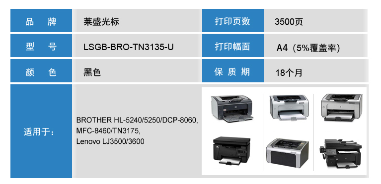 萊盛光標(biāo) LSGB-BRO-TN3135-U 黑色粉盒 適用:BROTHER HL-5240/5250DN/5340D 單位:支