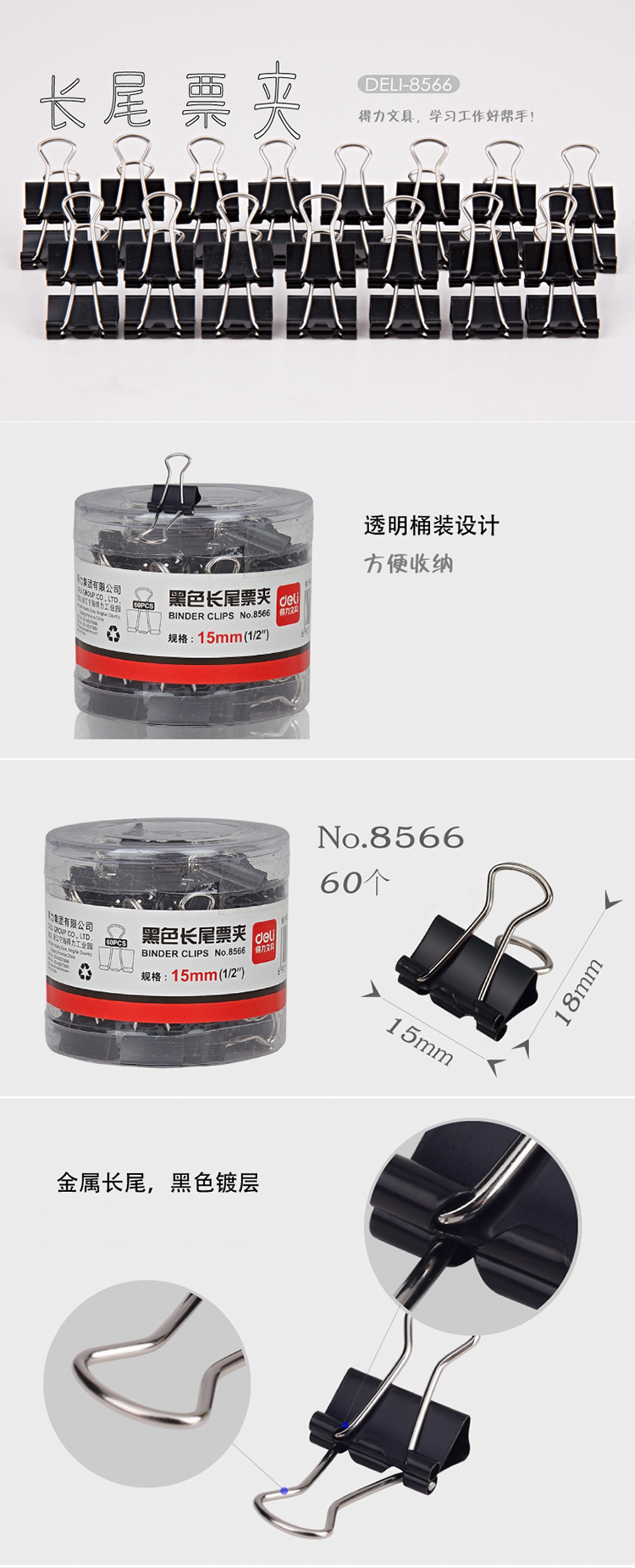 商品名稱(chēng):得力(deli)8566 6#黑色長(zhǎng)尾夾/長(zhǎng)尾票夾15mm 60只/筒