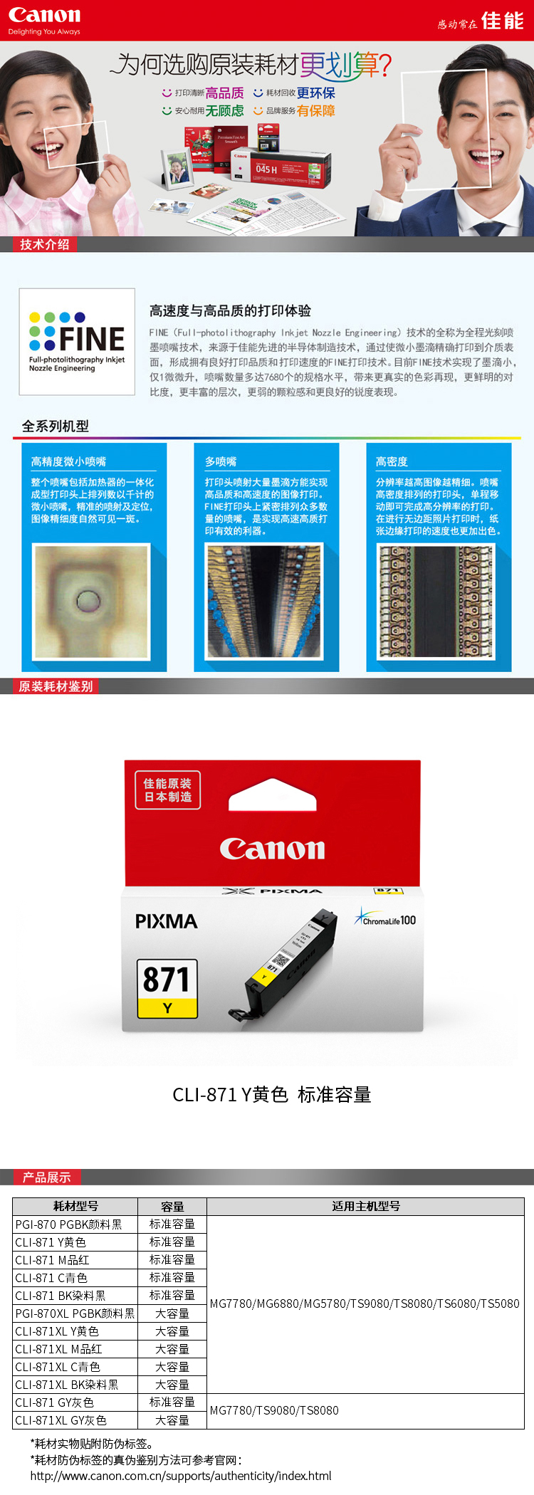 佳能墨盒 PGI-871 黃色墨盒 適用:MG7780、TS9080、TS8080、TS6080 單位:支