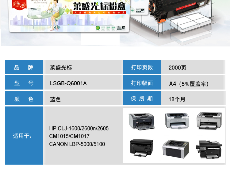 萊盛光標(biāo) LSGB-Q6001A 青色粉盒 適用:HP CLJ-1600/2600n/2605/CM1015/CM1017 CANON LBP-5000/5100 單位:支