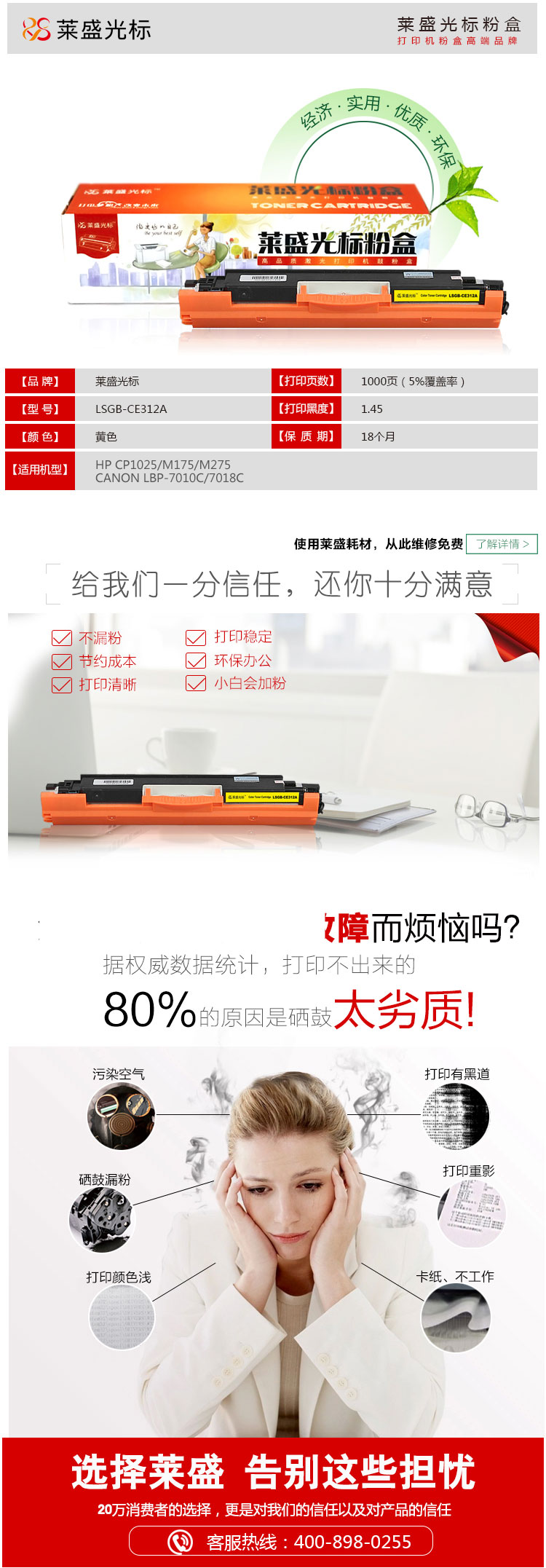 萊盛光標(biāo) LSGB-CE312A 黃色粉盒 適用HP CP1025/M175/M275 CANON LBP-7010C