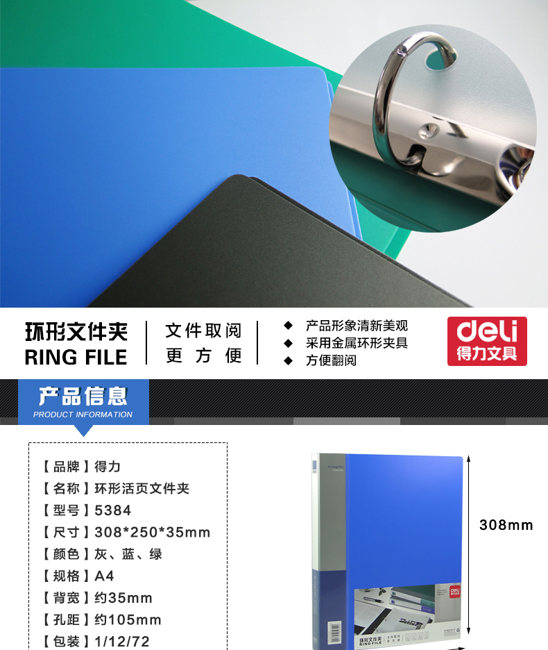 得力打孔文件夾 5384 A4紙3孔文件夾 單位:個