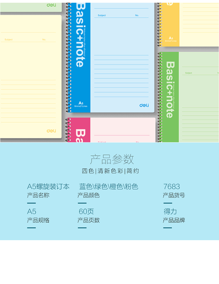 得力線圈本 7683 A5/60頁(yè)螺旋裝訂本記事本 單位:10本/包