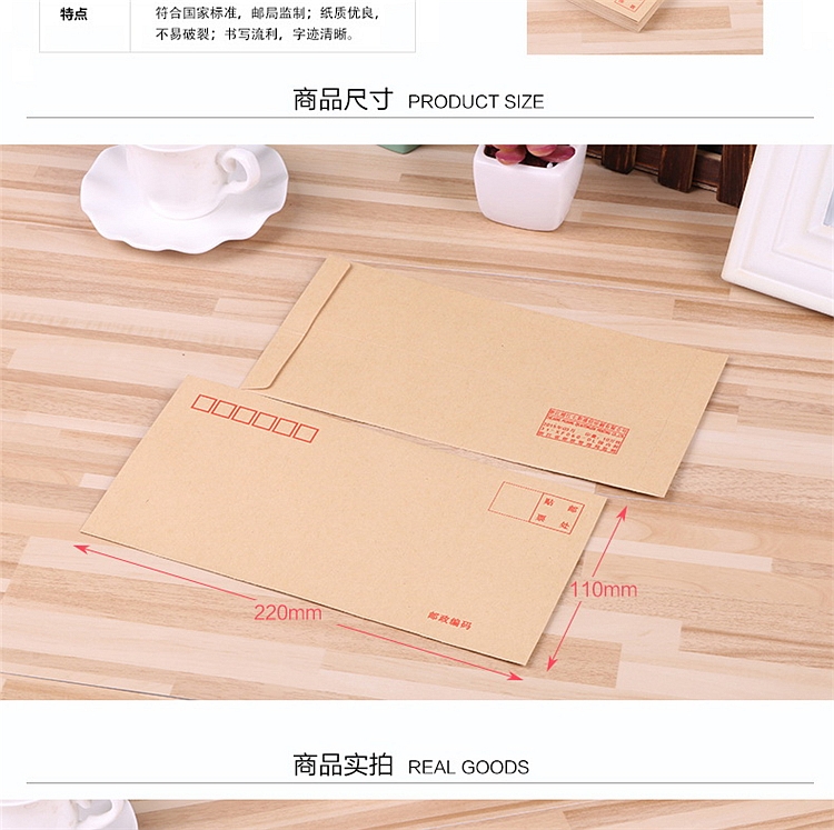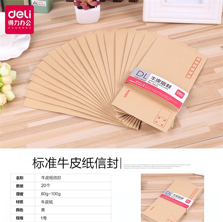 得力牛皮信封 3423 5號 郵局標(biāo)準(zhǔn)信封220*110mm 20張 單位:包