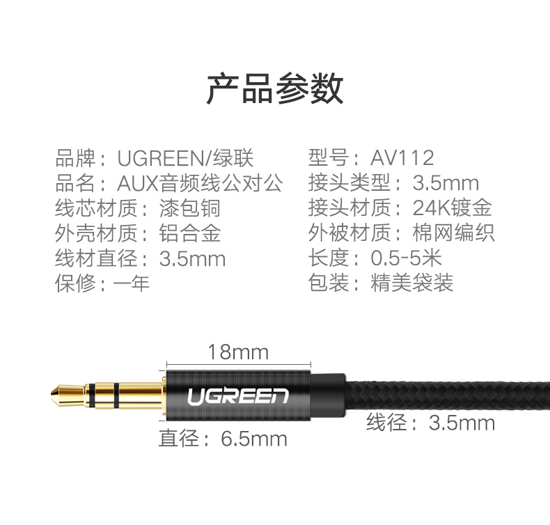綠聯(lián) AV112 AUX車用音頻線3.5mm公對(duì)公立體聲耳機(jī)連接線 1米 黑色 單位:根