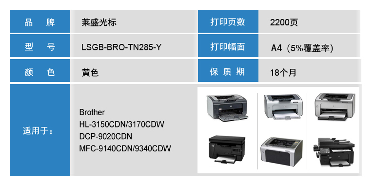 萊盛光標(biāo) LSGB-BRO-TN285-Y 黃色粉盒 適用:Brother HL-3150CDN/3170CDW 單位:支