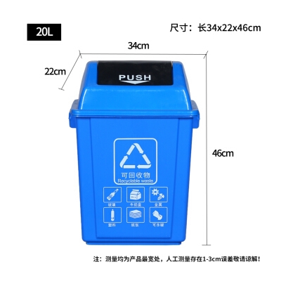 納麗雅 20L搖蓋 藍色 可回收垃圾分類垃圾桶帶蓋 飯店餐飲可回收廚余環(huán)衛(wèi)有害戶外四分類 單個裝
