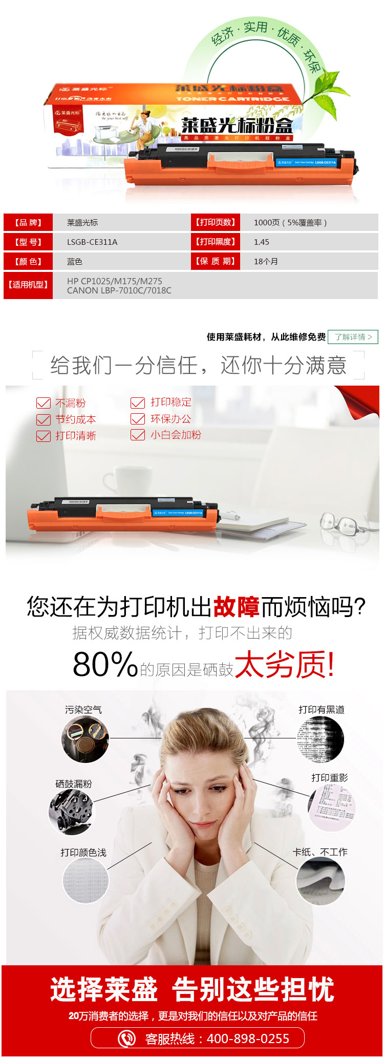 萊盛光標 LSGB-CE311A 青色粉盒 適用:HP CP1025/M175/M275 CANON LBP-7010C 單位:支