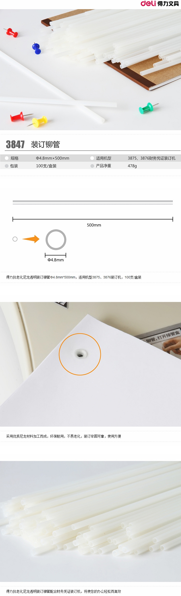 得力(deli) 裝訂鉚管 4.8mm*500mm 3847 100支/盒