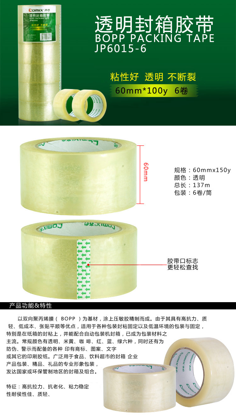 齊心膠帶 6010 60mm*100y(91.4米)普透封箱寬膠帶 單位:卷