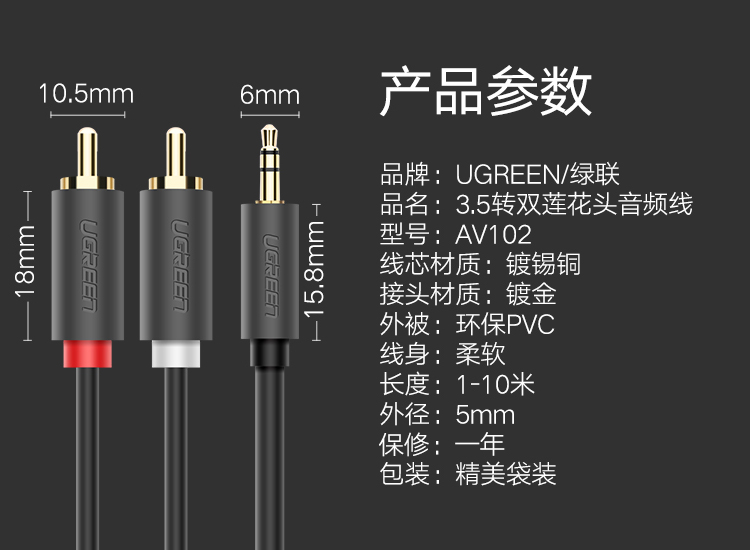 綠聯(lián) AV102 3.5mm公轉(zhuǎn)2RCA公音頻線手機(jī)電腦電視連接音響箱轉(zhuǎn)換線 1.5米 黑色 單位:根