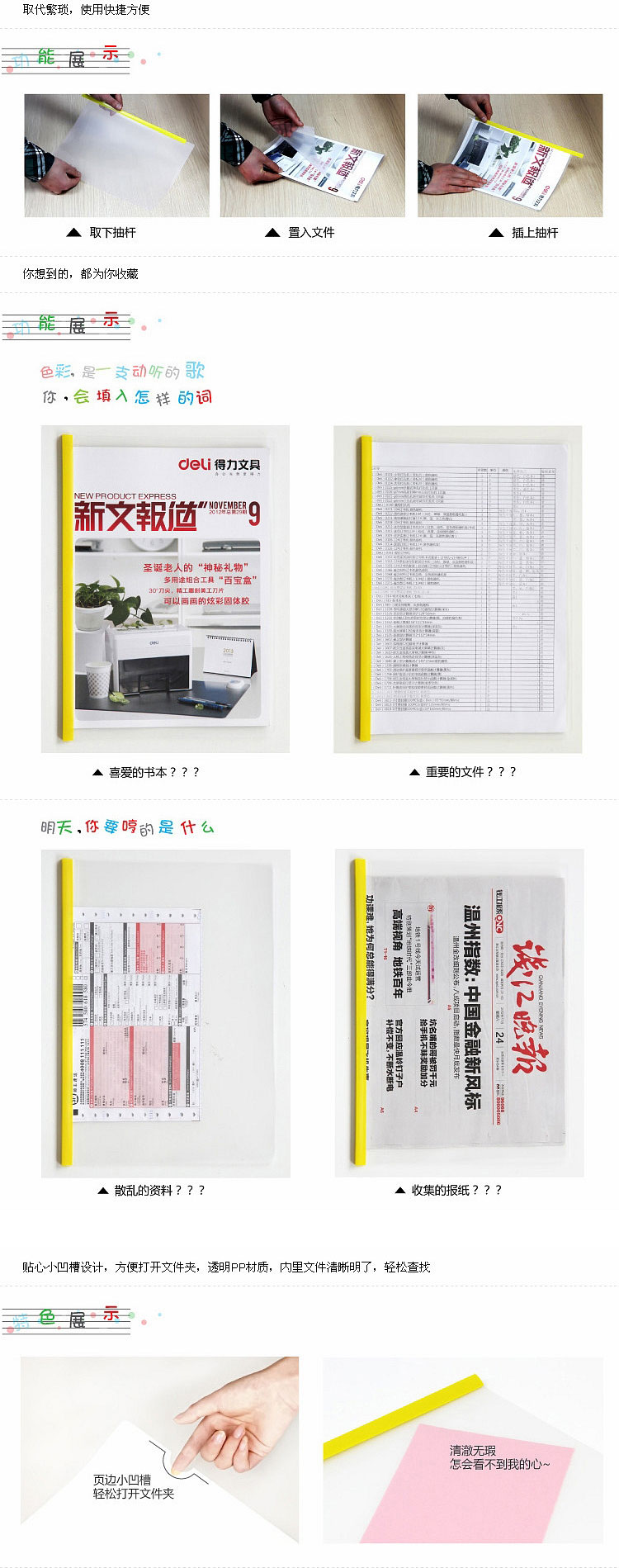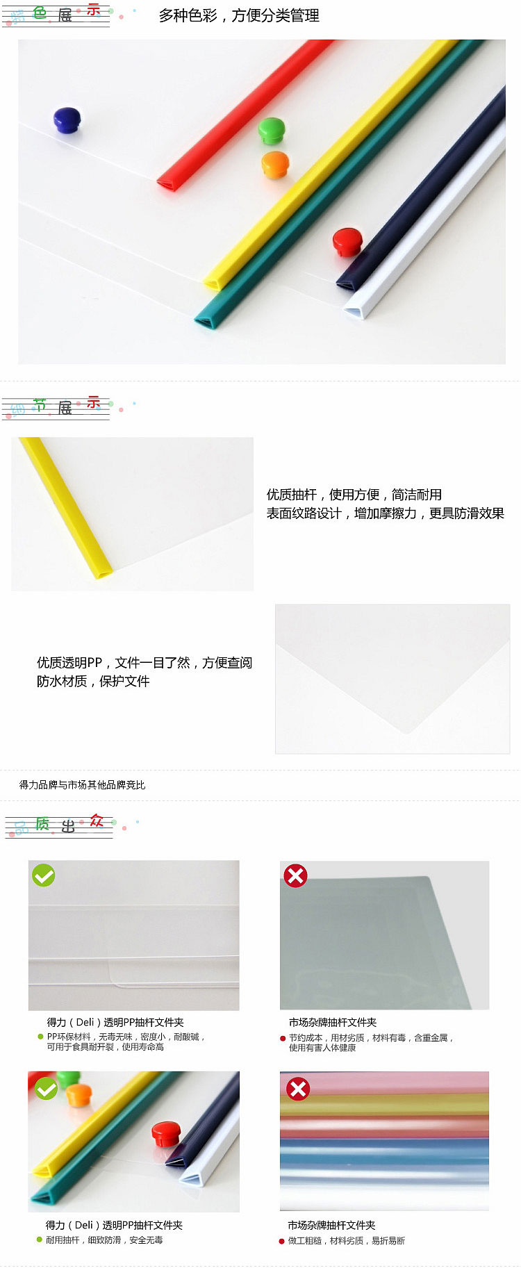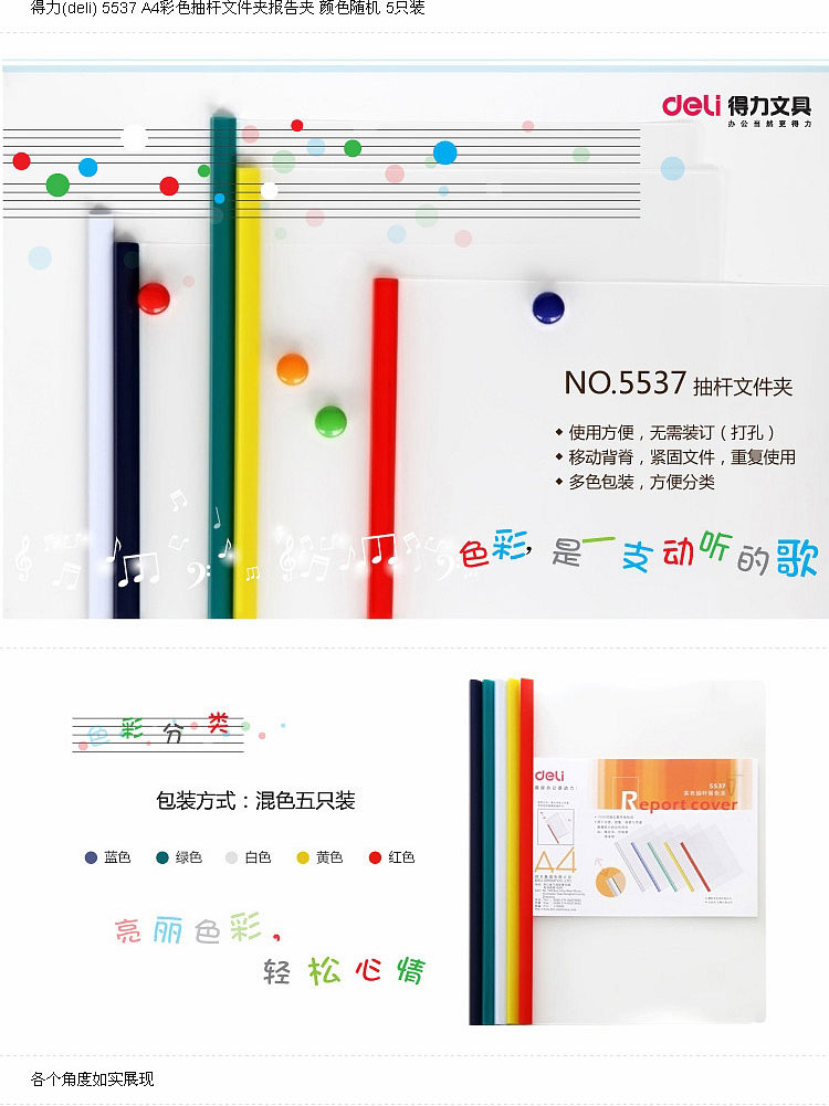 得力(deli)5537 透明抽桿夾/文件夾 文件封面 混色 五只裝