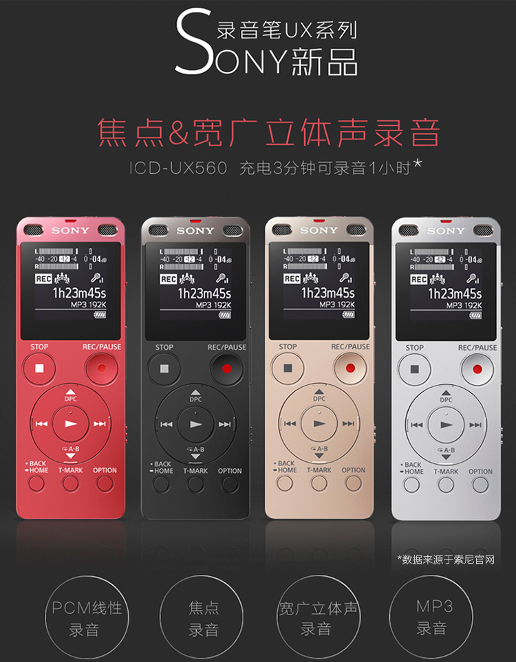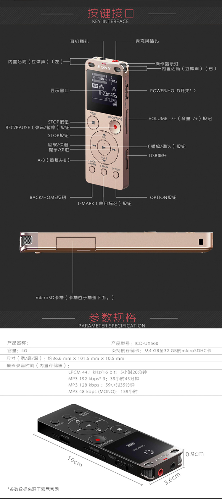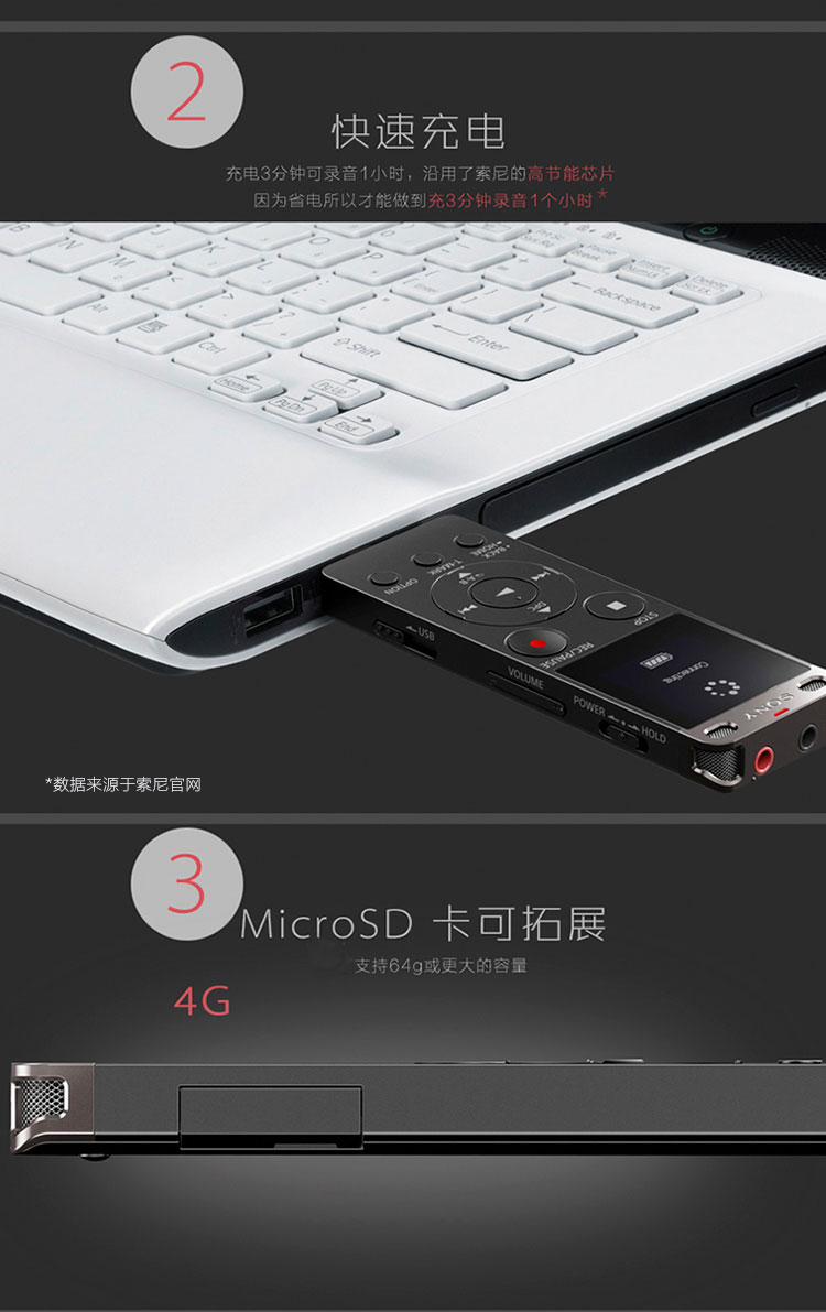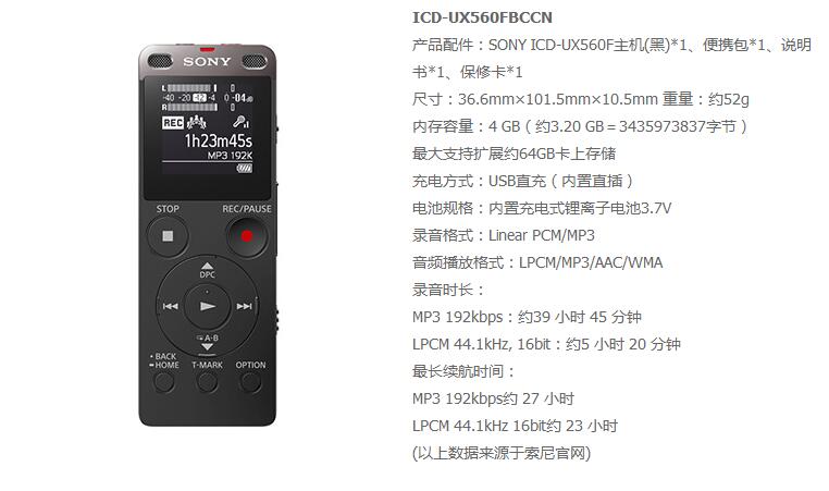 索尼錄音筆 ICD-UX560F 數(shù)碼錄音棒 4GB 黑色 單位:支