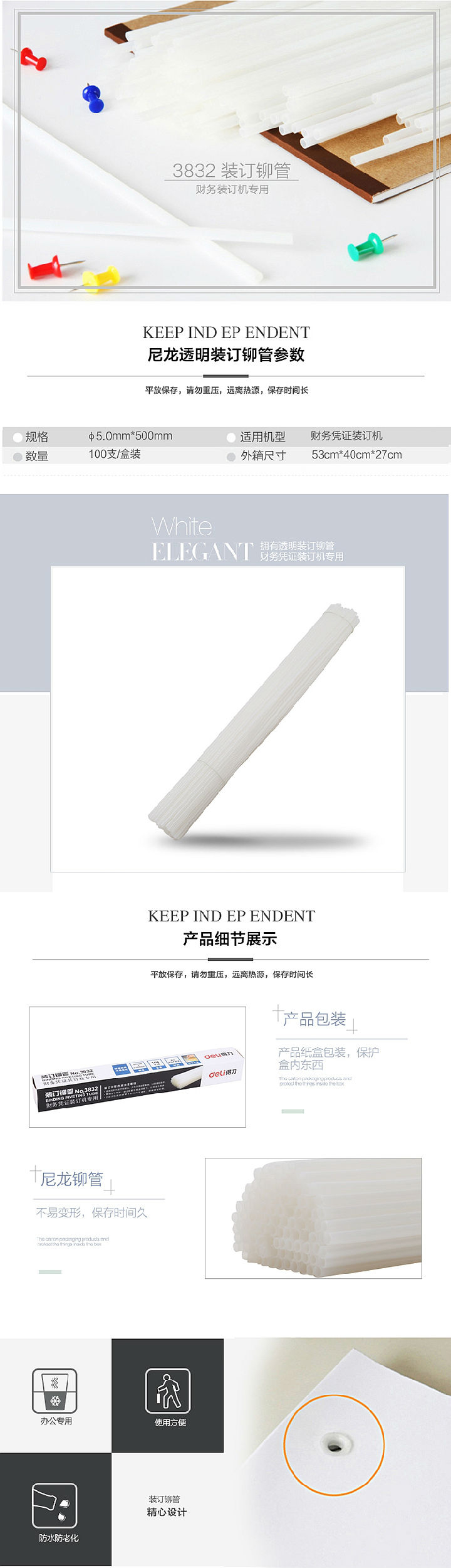 得力(deli) 裝訂鉚管 5.2mm*500mm 3832 100支/盒