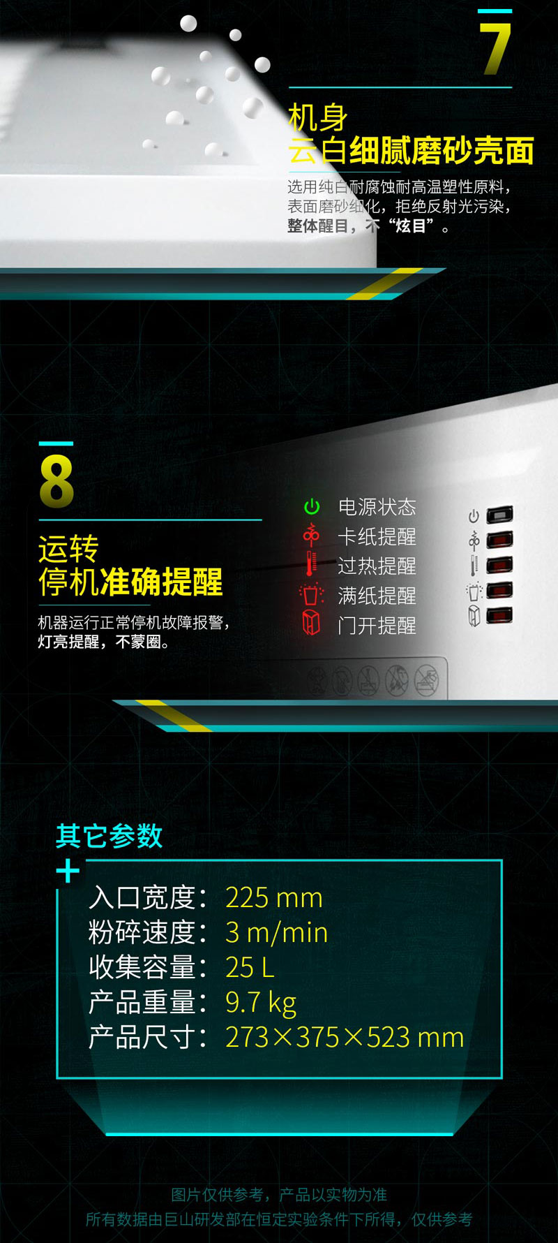 粉碎速度:3 m/min 紙箱容積:25 L 產(chǎn)品重量:9.7 kg 機(jī)器尺寸:375×273×523 mm