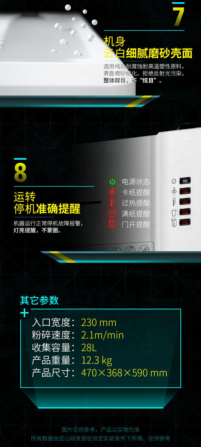 生產(chǎn)制造系中國(guó)保密協(xié)會(huì)會(huì)員單位 安全保護(hù)入紙擋板全面安全     滿紙門開多種運(yùn)行狀態(tài)LED顯示 光盤分類回收 PWM電流控制確保電機(jī)超靜音
