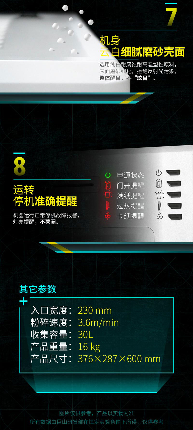 生產(chǎn)制造系中國保密協(xié)會(huì)會(huì)員單位 安全保護(hù)入紙擋板全面安全 滿紙門開多種運(yùn)行狀態(tài)LED顯示 光盤分類回收  PWM電流控制確保電機(jī)超靜音