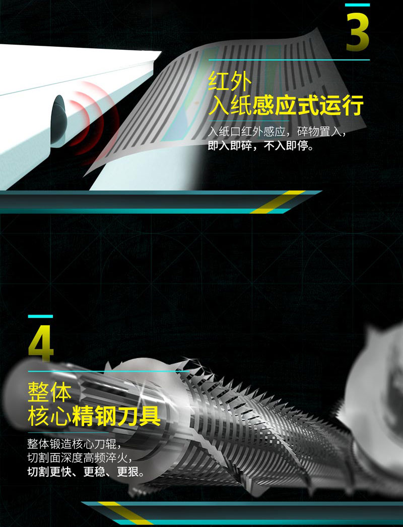 24小時(shí)持續(xù)粉碎 切割器5年質(zhì)保 門(mén)開(kāi)滿紙過(guò)自動(dòng)停機(jī) 風(fēng)冷系統(tǒng)工作持久 整體鋼刀耐用持久 具有過(guò)熱停機(jī)保護(hù) 卡紙自動(dòng)反轉(zhuǎn)保固