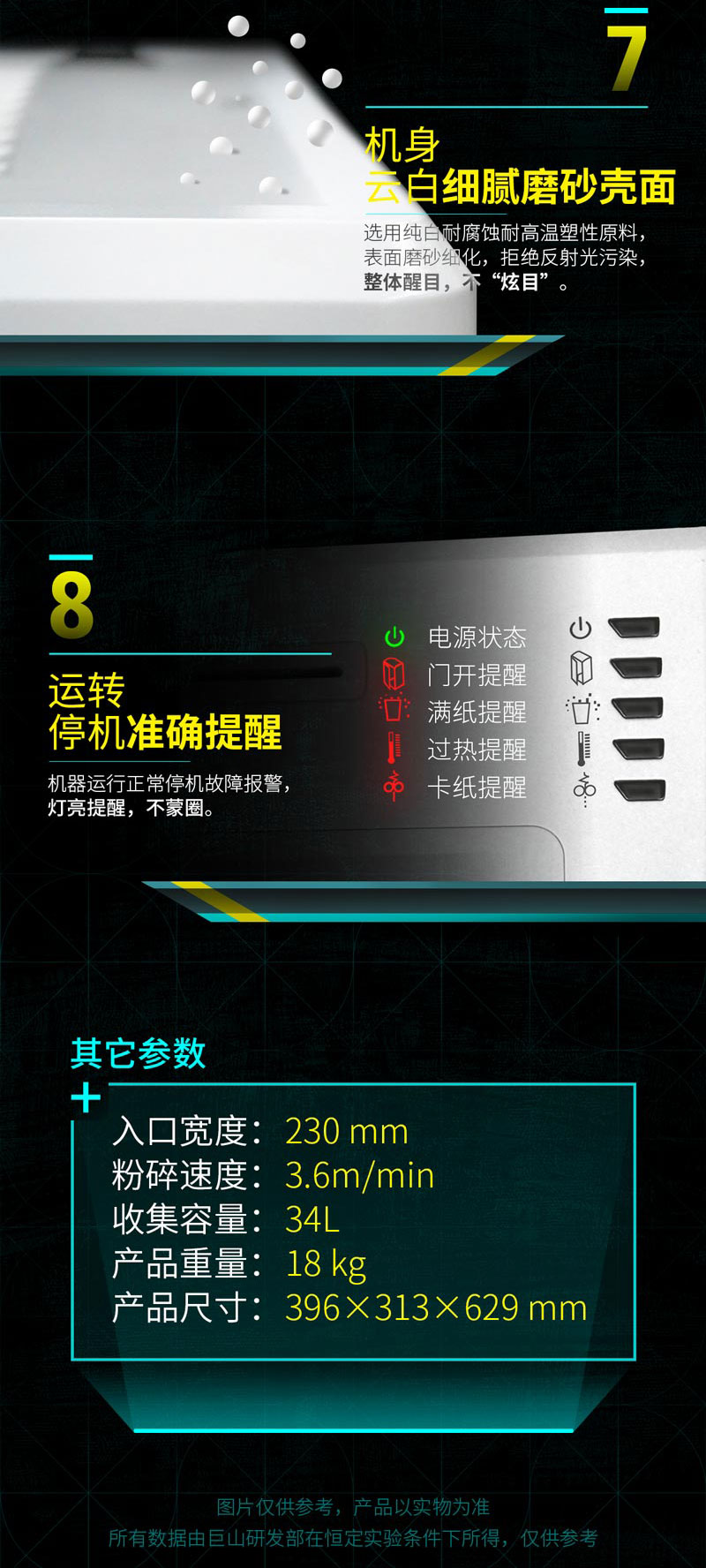 24小時持續(xù)粉碎 切割器5年質保 門開滿紙過自動停機 風冷系統(tǒng)工作持久 整體鋼刀耐用持久 具有過熱停機保護 卡紙自動反轉保固