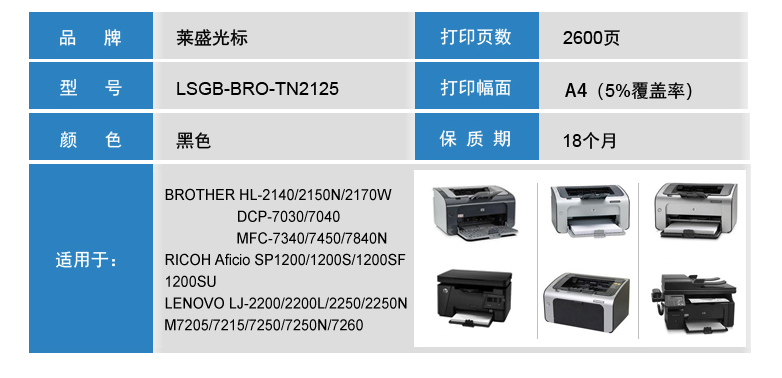 萊盛光標(biāo) LSGB-BRO-TN2125 黑色粉盒 適用:BROTHER HL-2140/2150N 單位:支