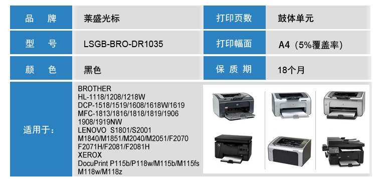 萊盛光標(biāo) LSGB-BRO-DR1035 黑色硒鼓 適用于BROTHER HL-1118/1208/1218DCP-1518 單位:支