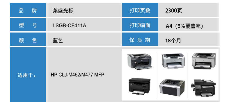萊盛光標(biāo) LSGB-CF411A 青色粉盒 適用:HP CLJ-M452/M477 MFP 單位:支
