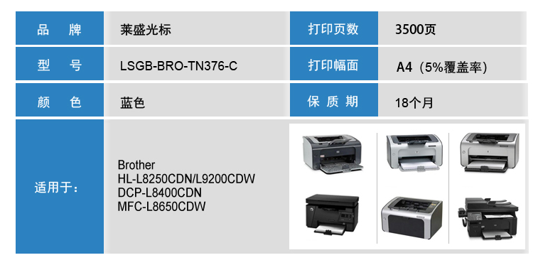 萊盛光標(biāo) LSGB-BRO-TN376-C 青色硒鼓 適用于Brother HL-L8250CDN/L9200CDW 單位:支