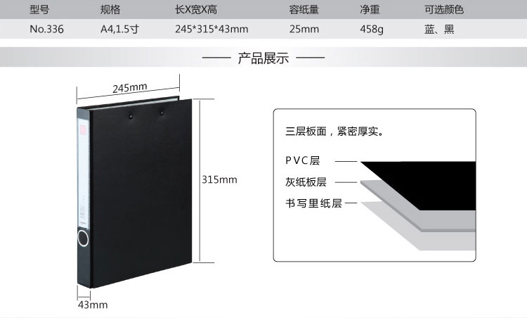 商品名稱:齊心 NO.336 辦公必備紙板夾 A4 1.5寸 2孔 基本單位:個(gè)