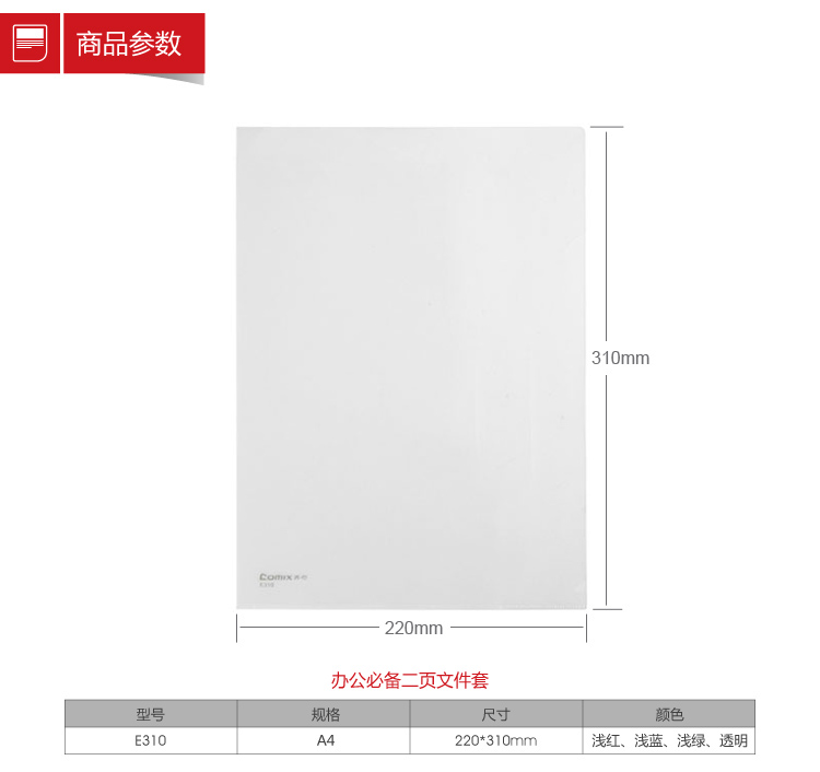 商品名稱:齊心 E310 辦公必備二頁文件套 A4  基本單位:10個/包