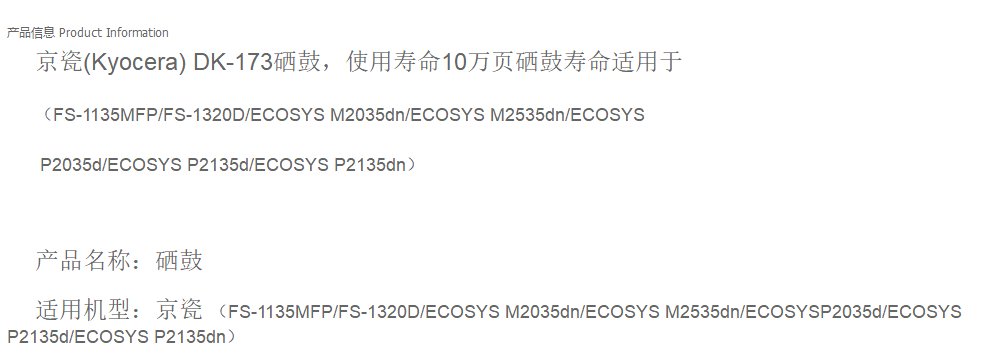 京瓷墨粉 DK-173 黑色硒鼓 適用:P2135dnFS-1135 單位:支