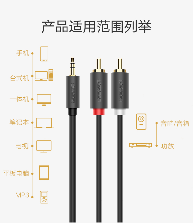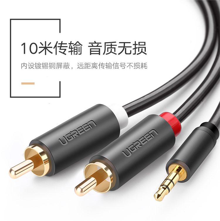 綠聯(lián) AV102 3.5mm公轉(zhuǎn)2RCA公音頻線 手機(jī)電腦電視連接音響箱轉(zhuǎn)換線 10米 黑色 單位:根