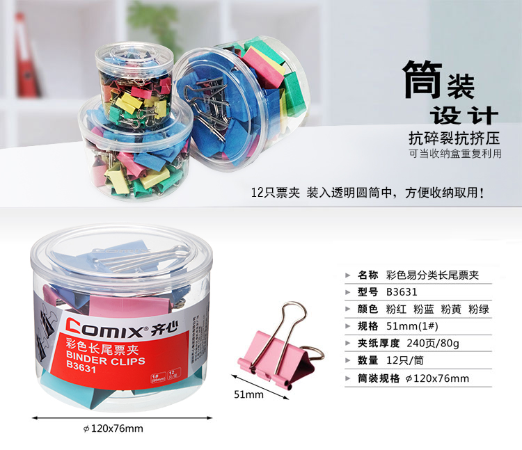 齊心(Comix) B3631 彩色長(zhǎng)尾夾 單位:筒