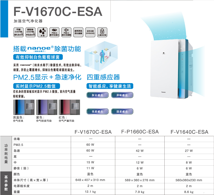松下空氣凈化器 F-V1670C-ESA 空氣凈化器 單位:臺(tái)