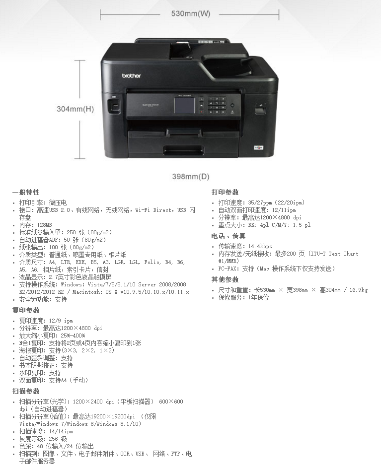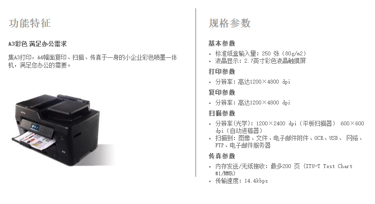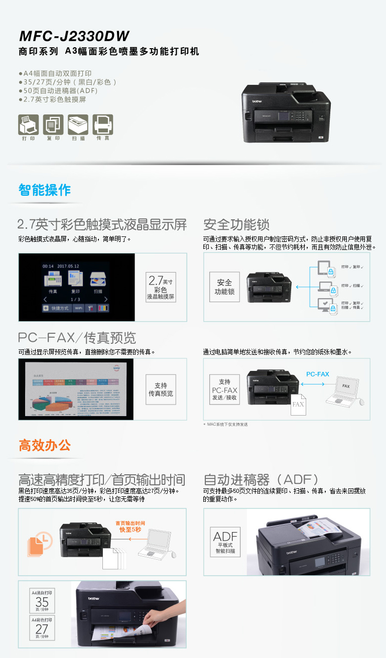 兄弟多功能一體機 MFC-J2330DW 彩色噴墨A3 單位:臺