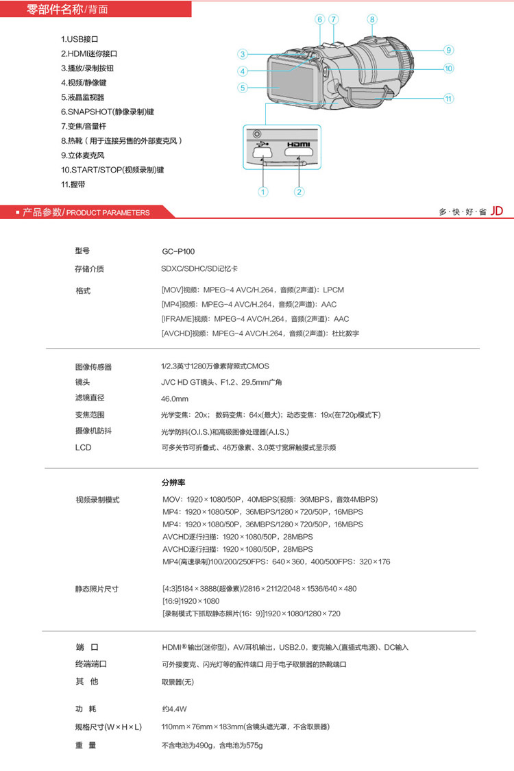 杰偉世攝像機 JVC GC-P100BAC 數(shù)碼攝像機 單位:臺