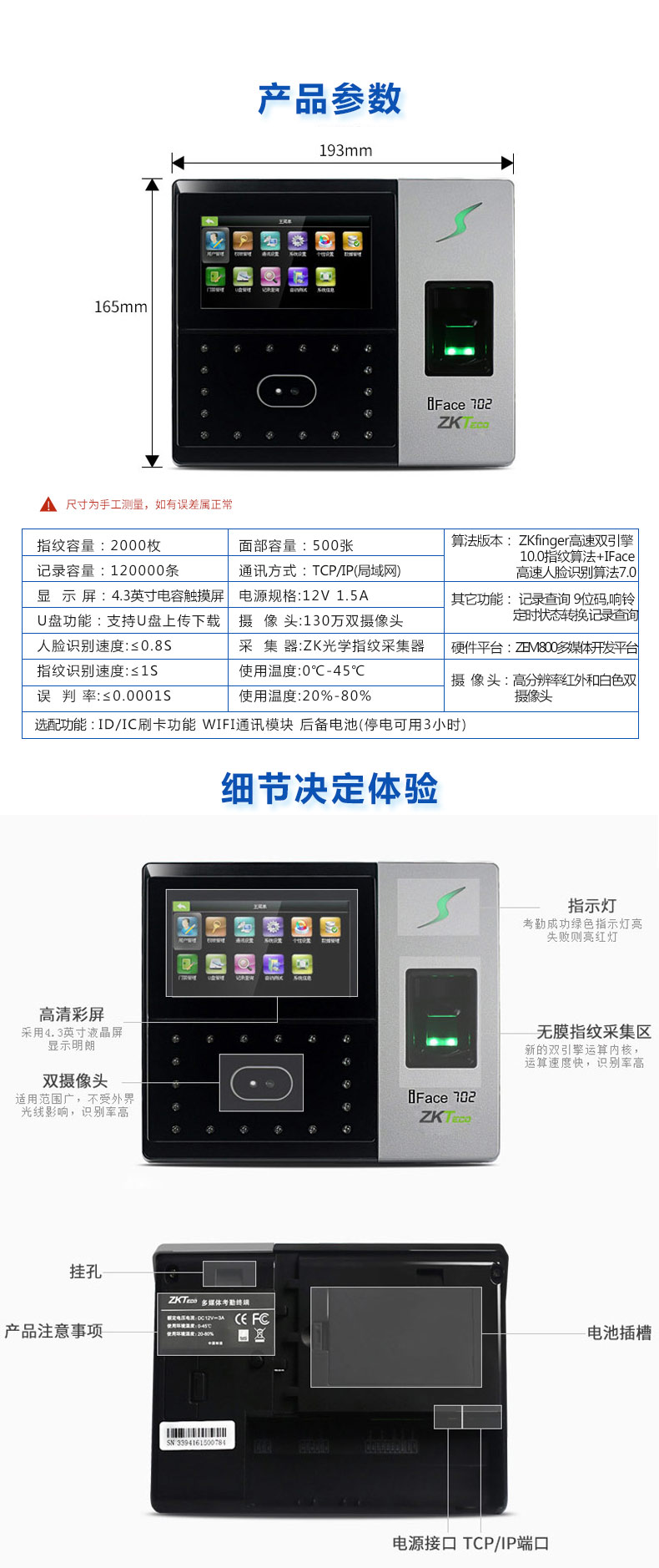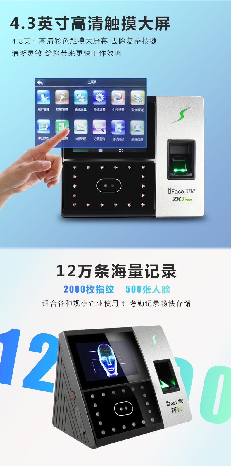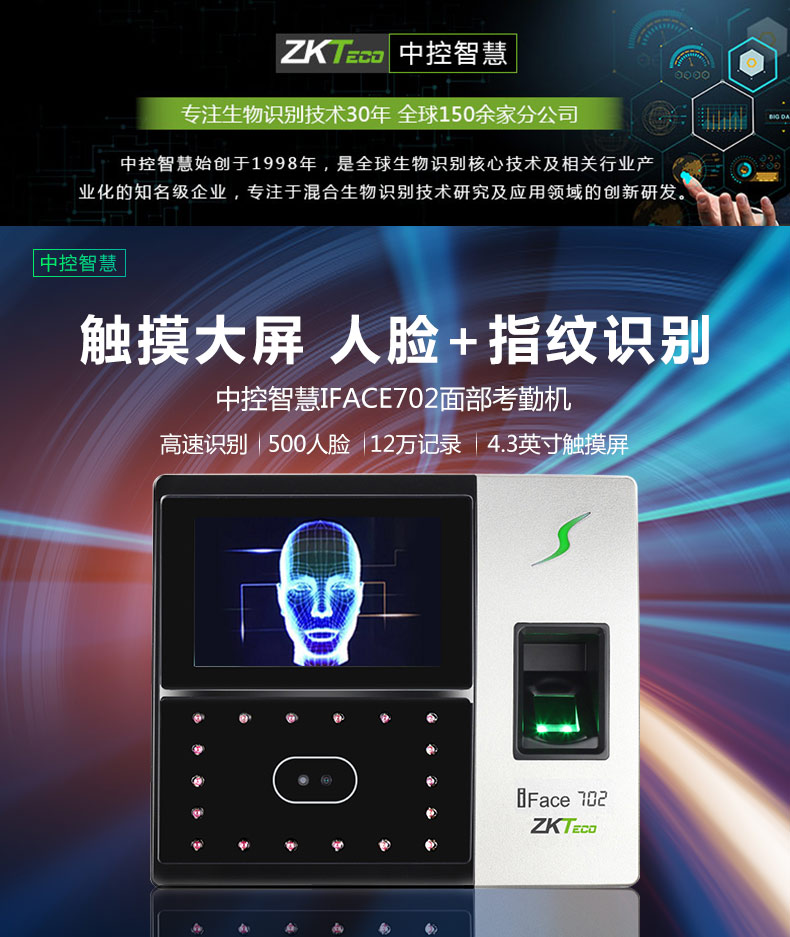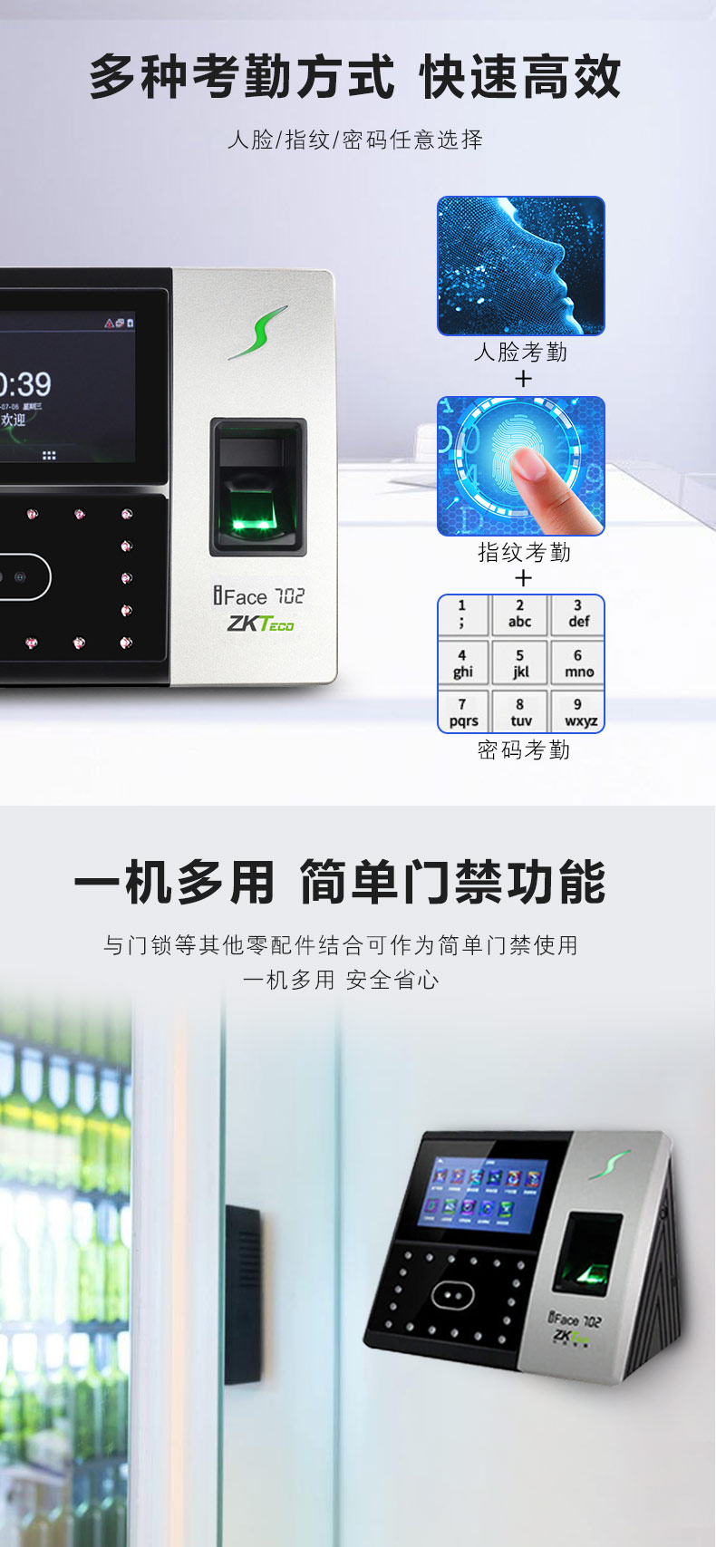 中控智慧考勤機(jī) iFace702 人臉指紋考勤機(jī) 觸屏操控門(mén)禁一體機(jī) 單位:臺(tái)