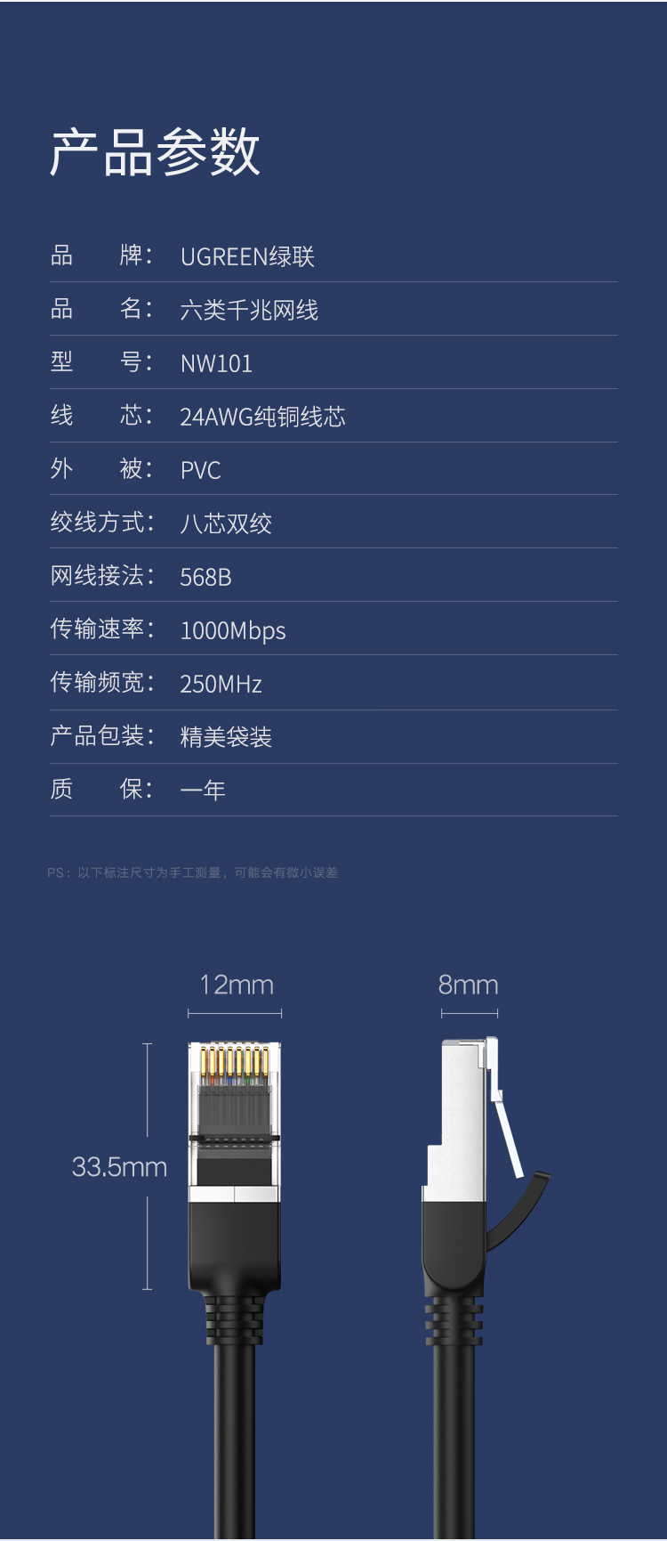 綠聯(lián)網(wǎng)線 NW101 CAT6類純銅八芯雙絞非屏蔽千兆高速網(wǎng)絡(luò)跳線 20米 單位:根