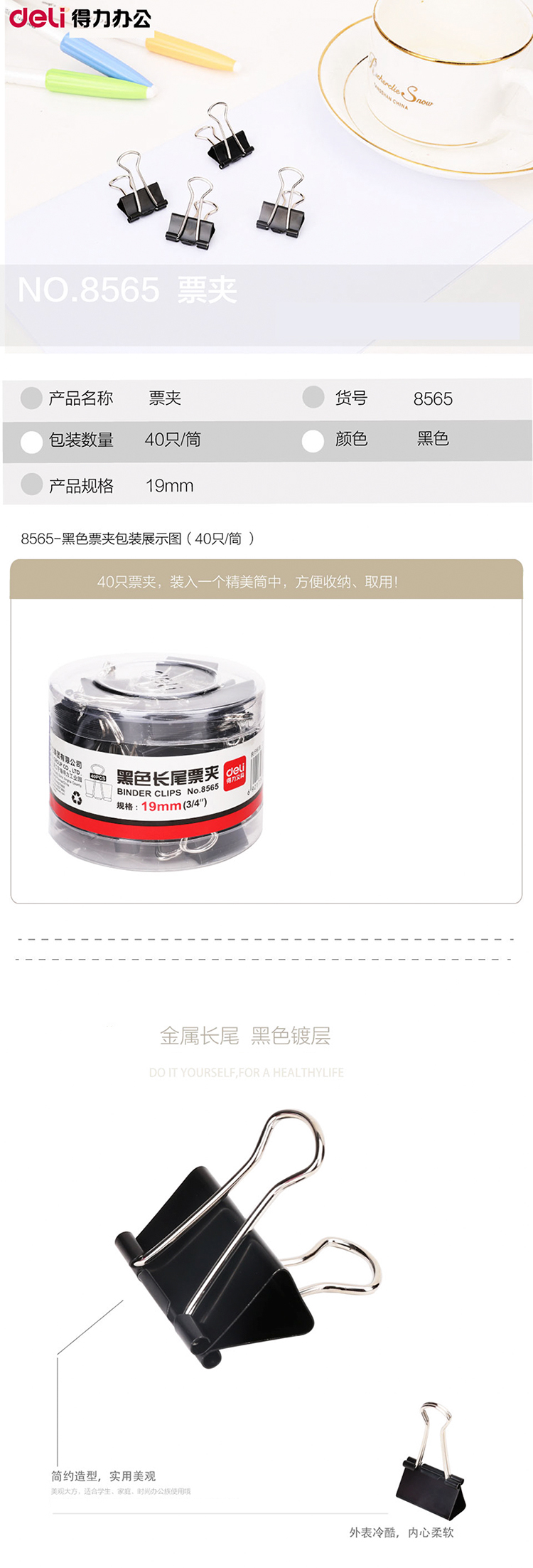 商品名稱:得力(deli)8565 5#黑色長尾夾/長尾票夾19mm 40只/筒
