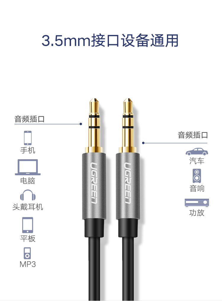 綠聯(lián) AV119 AUX車載音頻線 圓線 手機(jī)、MP3/4接音箱音頻線 黑色直頭對(duì)直頭 2米 黑色 單位:根