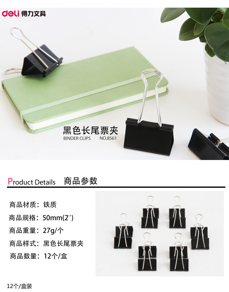 商品名稱:得力8561 1#黑色長尾夾/長尾票夾50mm 12只/筒