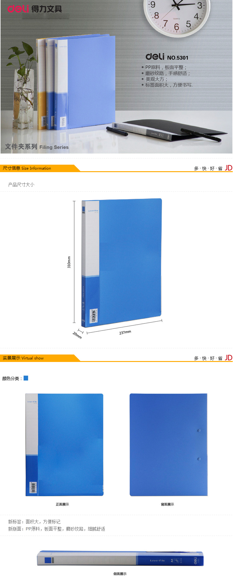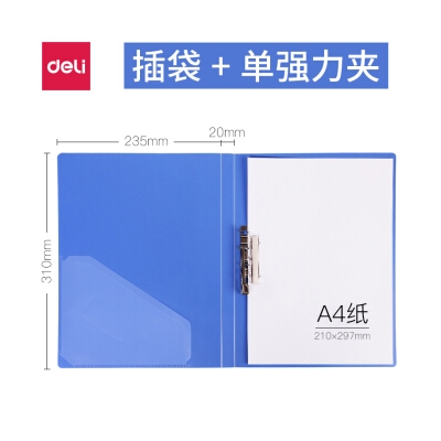 得力(deli) 5301 A4單強(qiáng)力夾+插袋 實(shí)用文件夾 藍(lán)色 單只裝