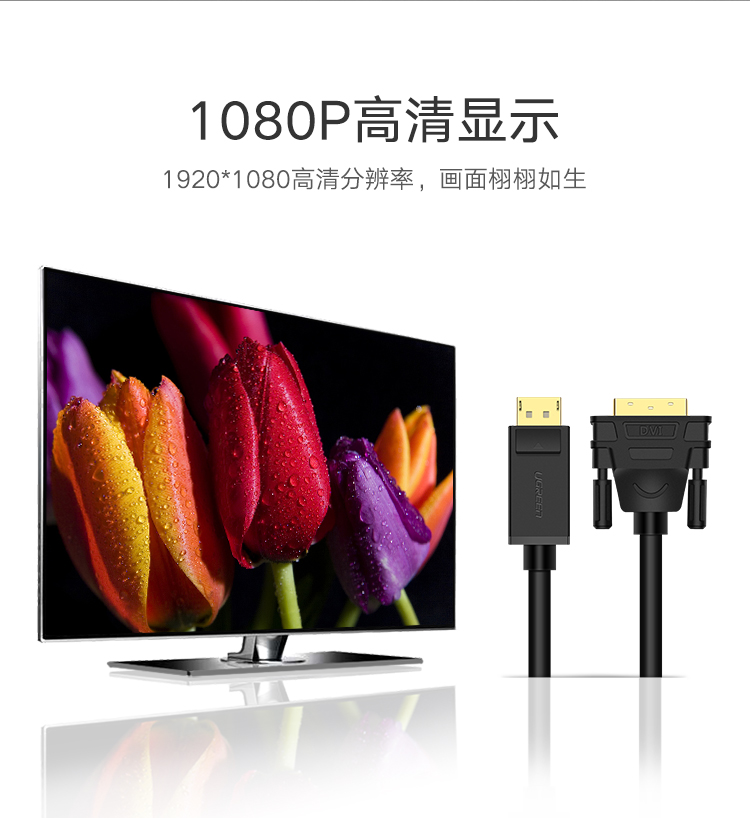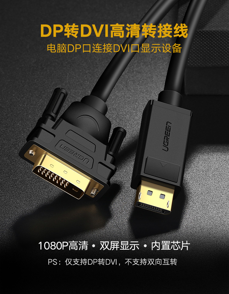 綠聯(lián) DP103 DP轉(zhuǎn)DVI轉(zhuǎn)換線 公對(duì)公高清轉(zhuǎn)接頭 電腦接顯示器投影儀連接線 2米 黑色 單個(gè)裝