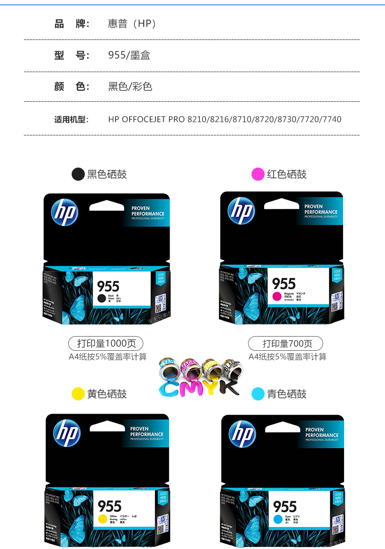 惠普墨盒 955 黃色墨盒 適用:HP 8210 8710 8720 8730 單位:支