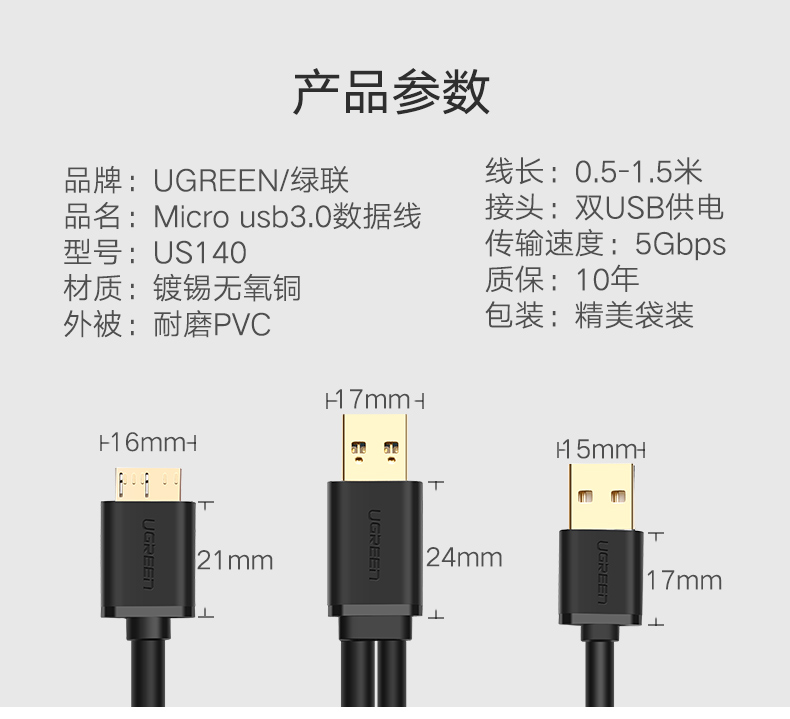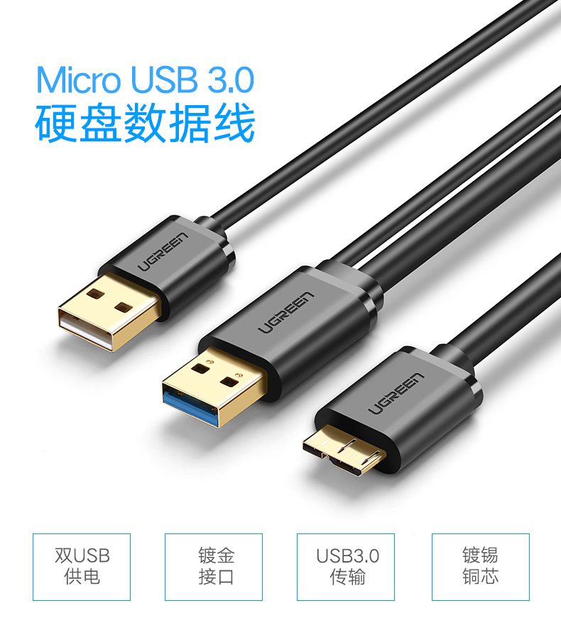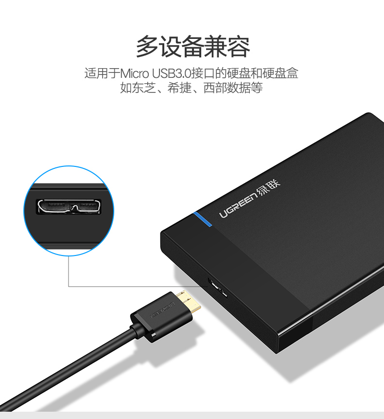 綠聯(lián) US140 USB3.0數(shù)據(jù)線 移動(dòng)硬盤盒高速傳輸連接線 黑色 單位:根40 Micro USB3.0數(shù)據(jù)線 移動(dòng)硬盤盒高速傳輸連接線 支持東芝希捷西數(shù)移動(dòng)硬盤 雙供電1米 黑色 單個(gè)裝