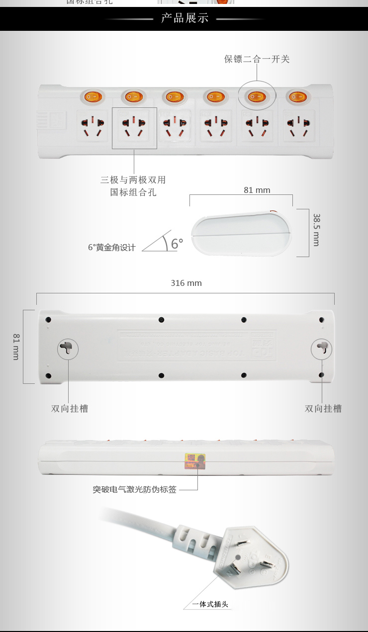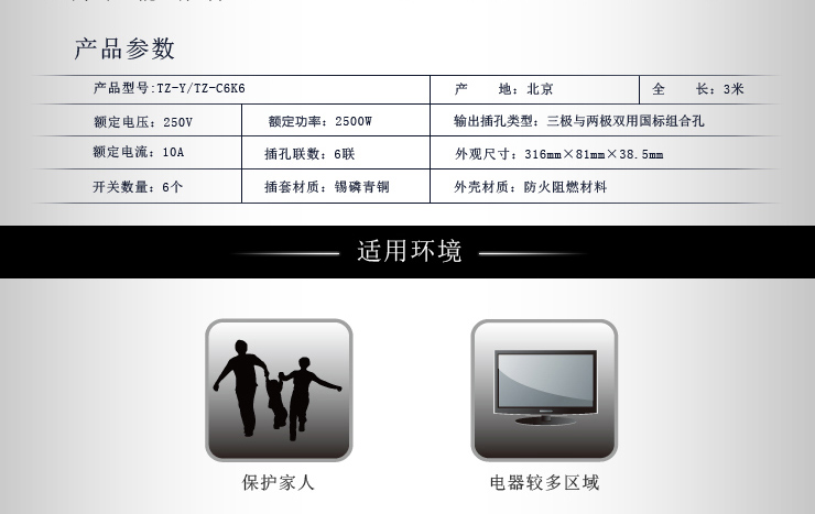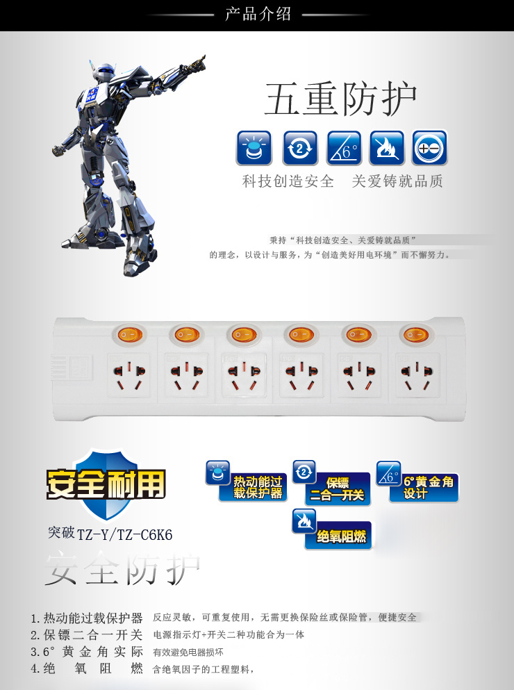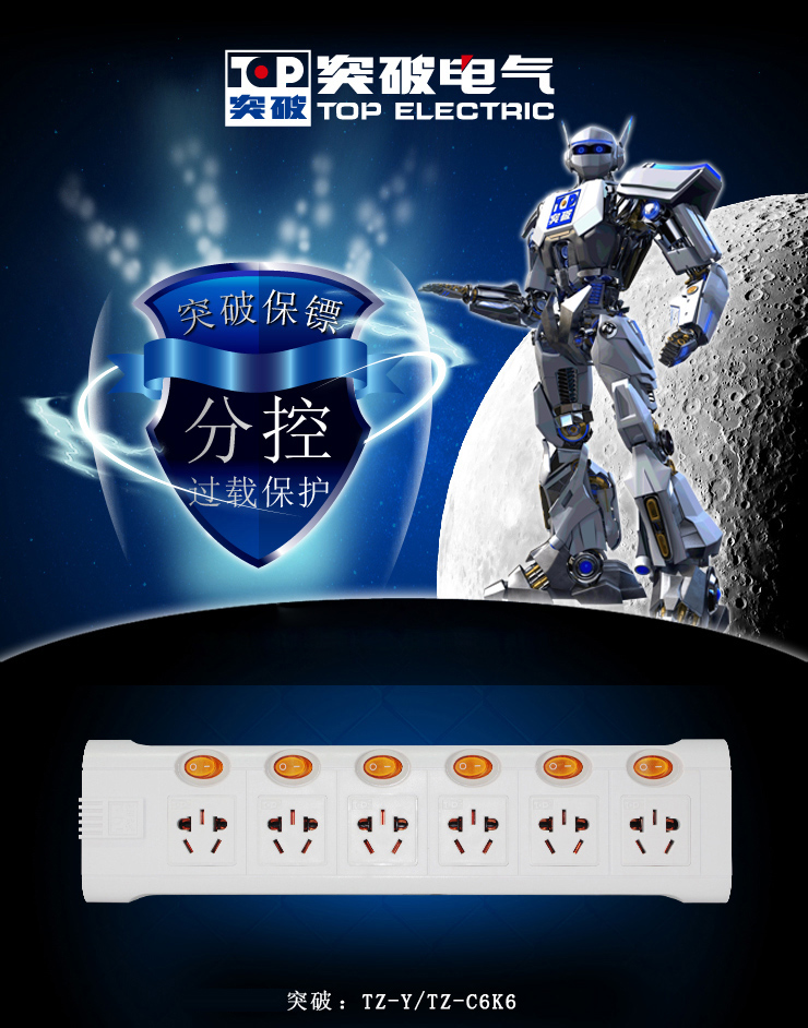 突破 TZ-D6K6 插座獨(dú)立開(kāi)關(guān) 接線板 過(guò)載保護(hù) 6孔拖線板 10米