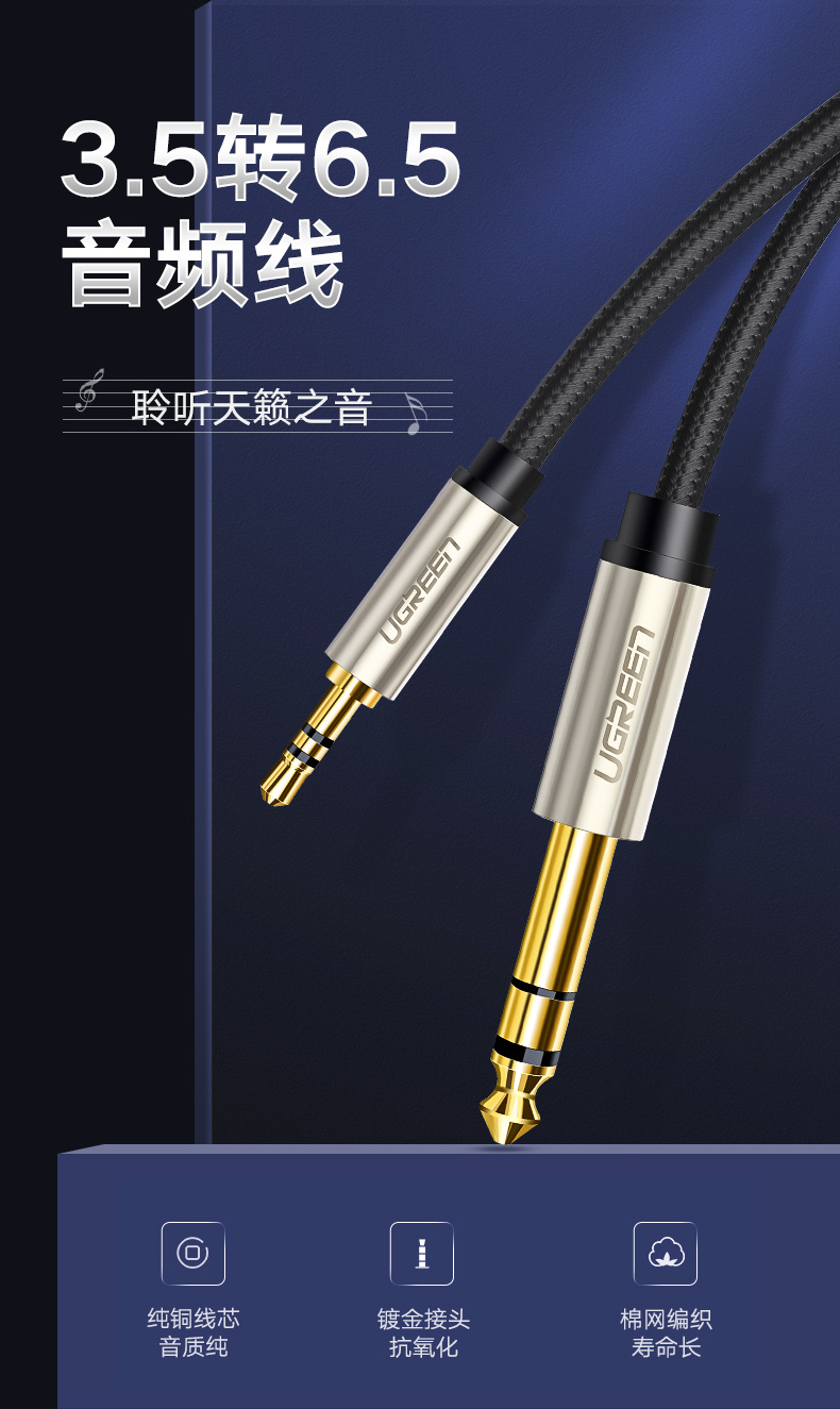 綠聯(lián) AV127 3.5mm轉(zhuǎn)6.5mm公對(duì)公音頻線 手機(jī)筆記本電腦音響箱連接線 6.35功放調(diào)音臺(tái)電吉他轉(zhuǎn)換線 棉網(wǎng)編織 5米 黑色 單個(gè)裝