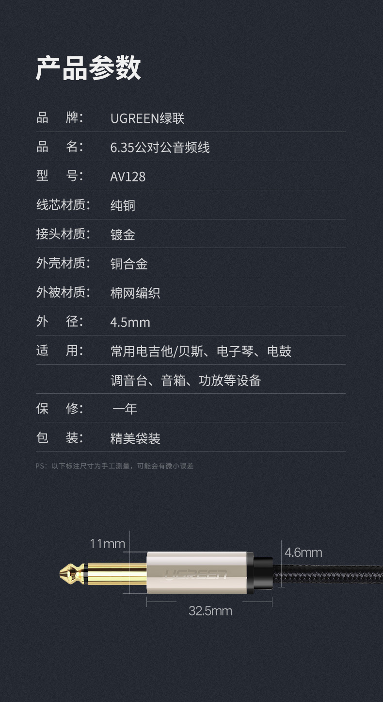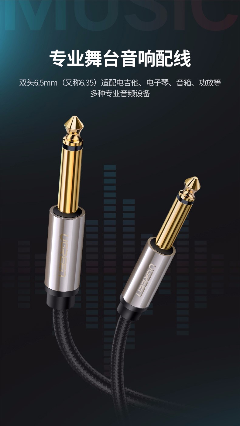 綠聯(lián) AV128 6.5mm音頻線6.35大二芯公對公連接線對錄線 音響音箱功放麥克風(fēng)電吉他電子琴鼓調(diào)音臺轉(zhuǎn)接線 棉網(wǎng)編織 3米 黑色 單個裝